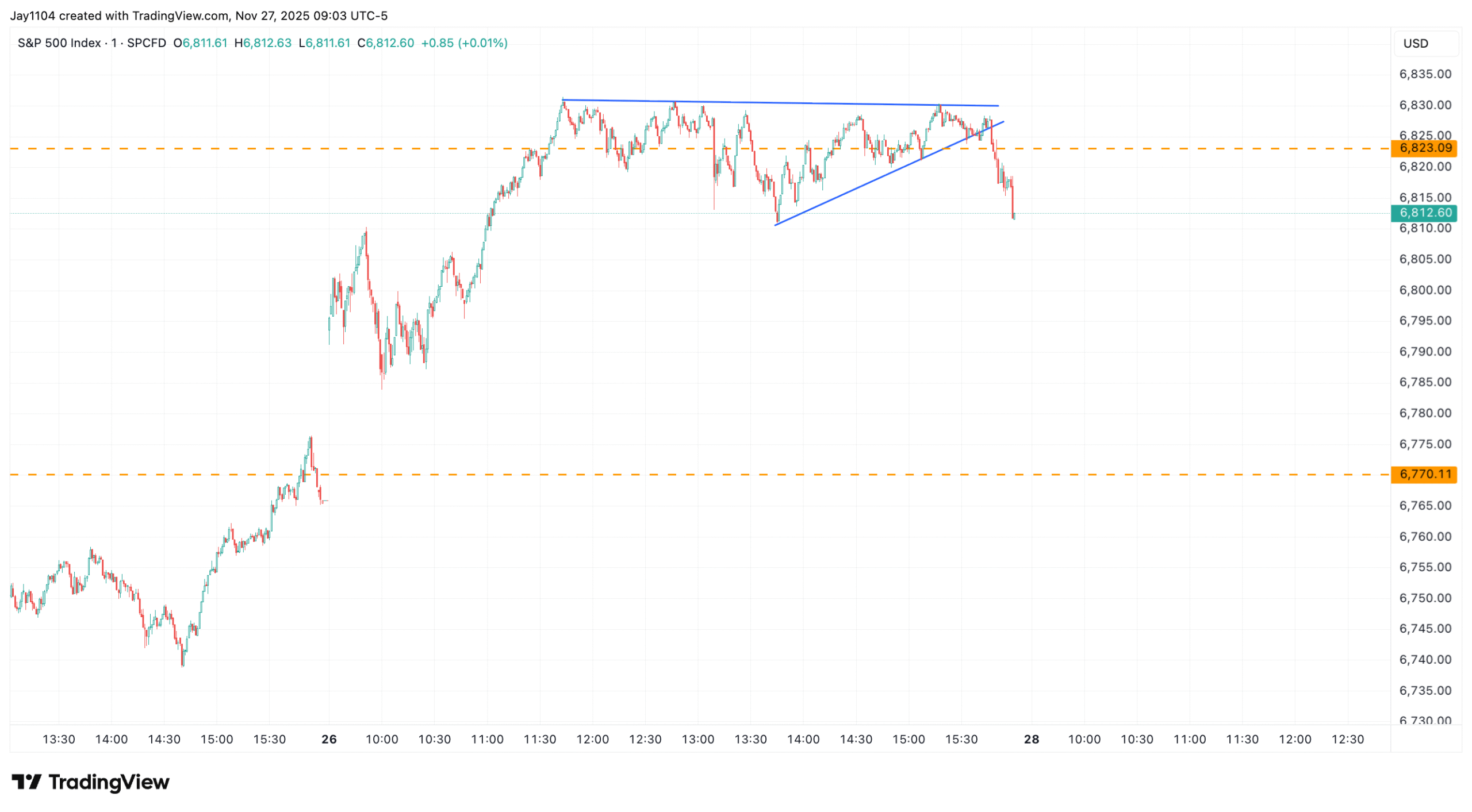 Coupled with a strongly positive gamma setup in the S&P 500, and major gamma resistance zones around 6,850 and 6,900 — we are in an environment where market makers will naturally act as sellers of rallies and buyers of dips. The problem is that if the index slips below 6,800, there is very little support until roughly 6,500, and the gamma-flip zone sits somewhere between 6,750 and 6,800. This means we are very close to flipping back into negative gamma territory should the market begin to weaken at all on Friday or Monday, at a time when liquidity will already be extremely thin. In that scenario, with virtually no support in the marketplace until much lower levels, it is quite possible that a meaningful portion of the past few days’ rally could be retraced quickly if mechanical flows reverse and take control of price action.