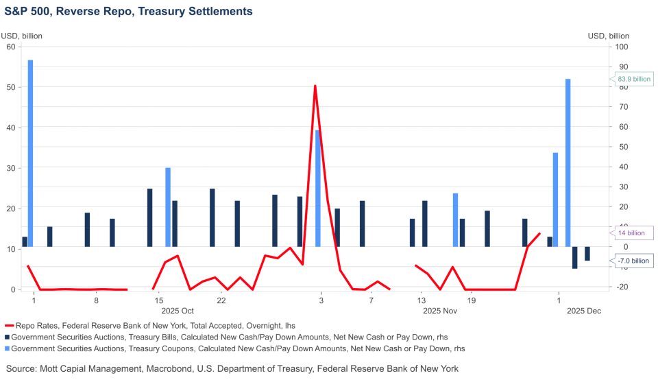 This matters a great deal because the two largest settlement dates of the week are still ahead of us. The biggest will occur on the 28th, when roughly $52 billion of Treasury bills and coupons are set to settle. Then, on December 1st, another $84 billion in coupons will settle. This will be followed by a net paydown of about $11 billion on December 2nd and another $7 billion on December 4th. Even with those paydowns, a substantial amount of liquidity will be drained on Friday and Monday. Combined with the month-end, these flows should tighten overnight funding rates and overall liquidity conditions as both dynamics play out simultaneously.